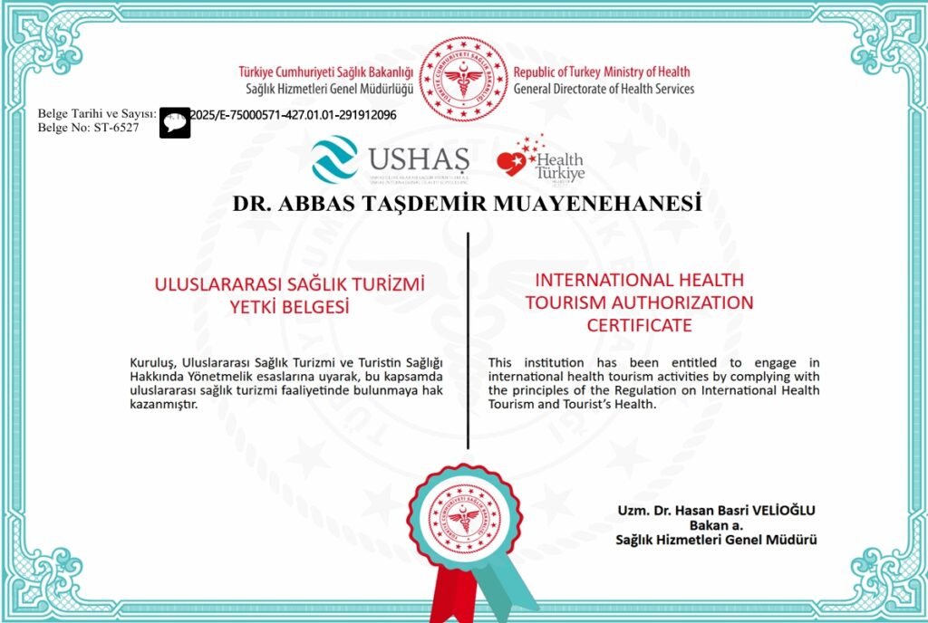 Tesisimiz, Uluslararası Sağlık Turizmi ve Turistin Sağlığı Hakkında Yönetmelik kapsamında, Uluslararası Sağlık Turizmi Sağlık Tesisi Yetkinlik Kriterleri’ne ve Yönetmeliğin genel esaslarına uyarak, Uluslararası Sağlık Turizmi faaliyetinde bulunmaya hak kazanmıştır.
